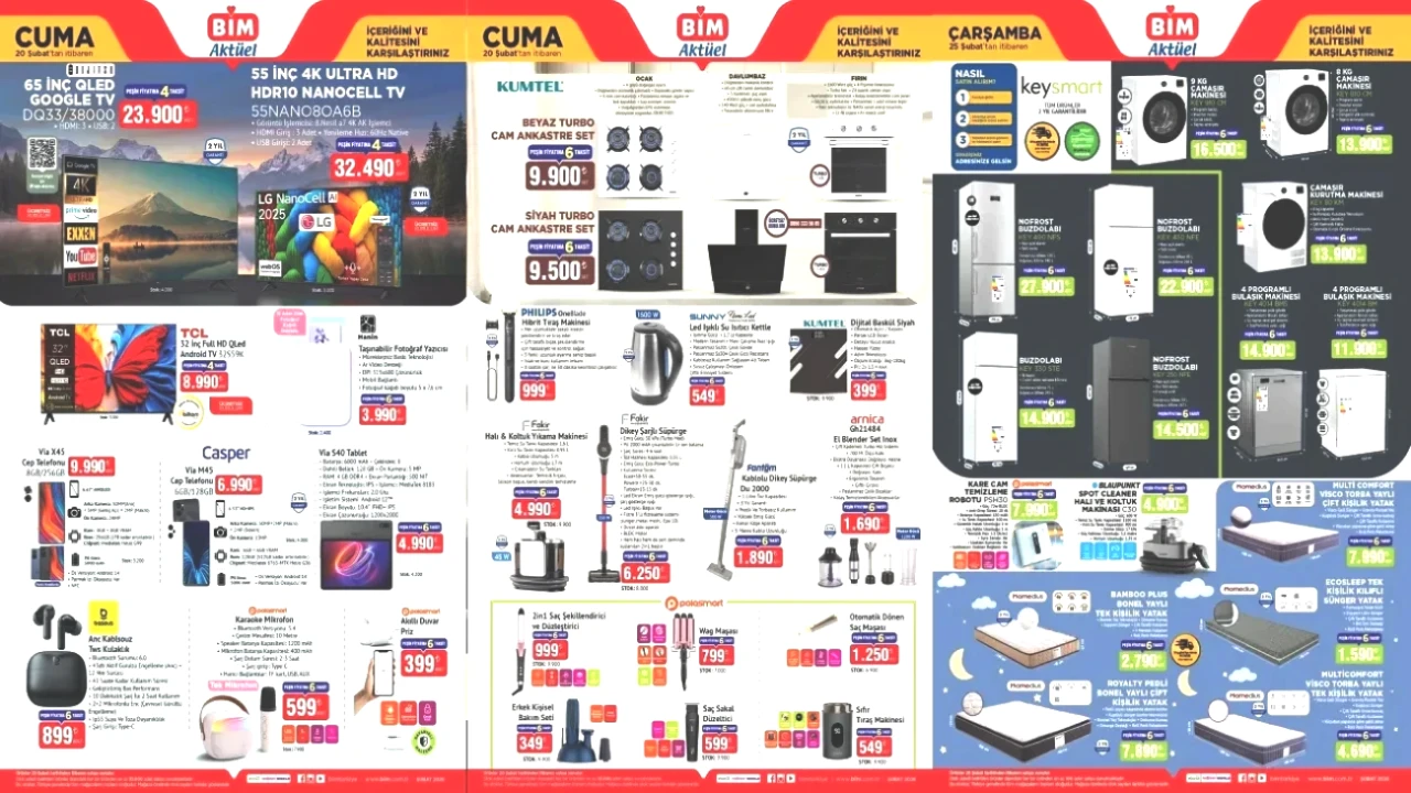 20 Şubat tarihli Bim aktüel ürünler afişiyle yeni hafta kataloğu duyuruldu. Alışveriş tutkunları için Ramazan öncesi Bim afişi oldukça ilgi çekiyor. 19 Şubat 2026 tarihli indirimli ürün listesi Bim tarafından paylaşıldı. Bu hafta merakla beklenen ürünler arasında Bütün Piliç, Dana Baton Kavurma ve Oyuncaklı Yumurta yer alıyor. BİM'in yeni hafta ürünleri ve güncel fiyatlar paylaşıldı. Ürünlere, bim.com.tr üzerinden de ulaşabilirsiniz. 20 Şubat 2025 kataloğunda Arnica El Blender Seti 1.690 TL, Polosmart Wag Maşası 799 TL, Kelebek Kurutmalık 719 TL, Ütü Masası 879 TL ve Silikon Spatula Seti 59 TL'ye satışta. Bu hafta Bim'de hangi yeni ürünler var? İşte detaylı inceleme için bim aktüel ürünler kataloğu…