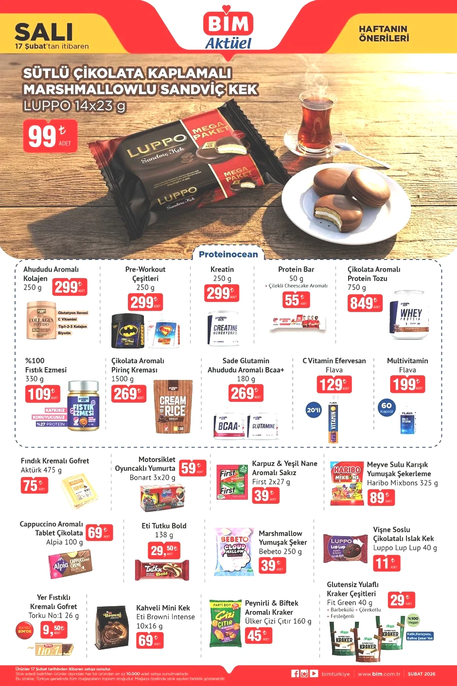 BİM AKTÜEL 20 ŞUBAT 2026 KATALOĞU Banvit Lezita Keskinoğlu Bütün Piliç 1000 gr 59,90 TL Emin Dana Baton Kavurma 1000 gr 899 TL Dost %10 Yağlı Yoğurt 1000 gr 79,50 TL Teksüt Tam Yağlı Taze Kaşar Peyniri 1000 gr 299 TL Aknaz Yarım Yağlı Tost Peyniri 1500 gr 299 TL İçim Yarım Yağlı Dilimli Tost Peyniri 1000 gr 279 TL Otat Tereyağı 1000 gr 479 TL Kinder Oyuncaklı Yumurta 20 gr 35 TL Karlitepe Karpuz Çilek Aromalı Maden Suyu 6×200 ml 45 TL Patito Patates Cipsi Ranch Izgara Aromalı 135 gr 31 TL Patito Patates Cipsi Tuz Sirke Aromalı 150 gr 35 TL Patito Patates Cipsi Çeşitleri Sade Ketçap Aromalı 200 gr 47,50 TL Hazarbey Dut Kurusu 100 gr 75 TL Munchiz Mısır Çerezi Çeşitleri Peynir Süt Mısır Aromalı 117 gr 39 TL Patos Rolls Mısır Cipsi Acı Biber Misket Limon Aromalı 109 gr 29,50 TL Nutova Kabak Çekirdeği 200 gr 62,50 TL Fellas Kuruyemiş Bar Fındıklı Kakaolu 3×30 gr 119 TL Kinder Çilekli Süt Dilimi 28 gr 21 TL Kinder Country Sütlü Çikolata Kaplı Buğday Patlaklı Bar 23,5 gr 14,75 TL Nutella 1 kg 339 TL Kinder Bueno Fındık Dolgulu Sütlü Çikolata Kaplamalı Gofret 21,5 gr 31 TL Hanuta Fındıklı Kremalı Gofret 22×2 gr 45 TL Luppo Sütlü Çikolata Kaplamalı Marshmallowlu Sandviç Kek 14×23 gr 99 TL Ahududu Aromalı Kolajen 250 gr 299 TL Pre-Workout Çeşitleri 250 gr 299 TL Kreatin 250 gr 299 TL Protein Bar Çilekli Cheesecake Aromalı 50 gr 55 TL Çikolata Aromalı Protein Tozu 750 gr 849 TL %100 Fıstık Ezmesi 330 gr 109 TL Çikolata Aromalı Pirinç Kreması 1500 gr 269 TL Sade Glutamin Ahududu Aromalı BCAA+ 180 gr 269 TL C Vitamin Efervesan Flava 129 TL Multivitamin Flava 199 TL Aktürk Fındık Kremalı Gofret 475 gr 75 TL Bonart Motorsiklet Oyuncaklı Yumurta 3×20 gr 59 TL First Karpuz Yeşil Nane Aromalı Sakız 2×27 gr 39 TL Haribo Mixbons Meyve Sulu Karışık Yumuşak Şekerleme 325 gr 89 TL
